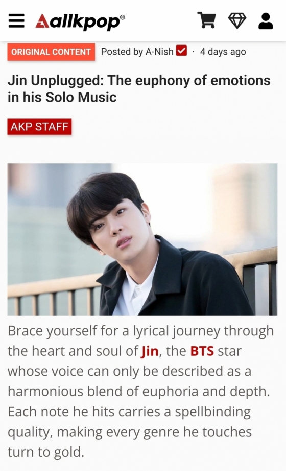 미국 연예 매체 올케이팝(Allkpop)은 지난 5일 진이 데뷔 후 발표한 솔로곡들에 대한 탐구와 정서적 울림에 대해 집중 조명했다.