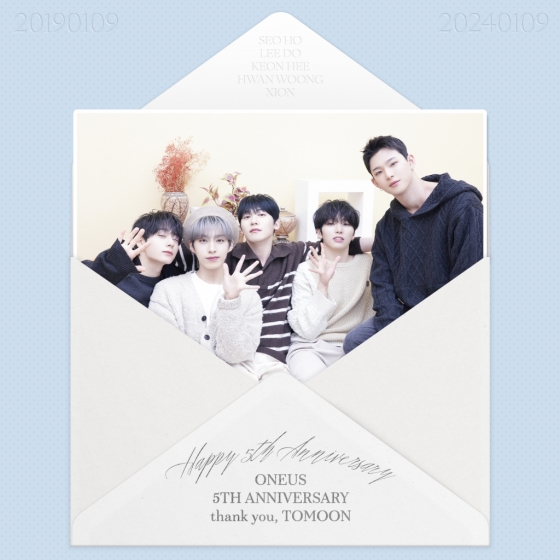 원어스(서호, 이도, 건희, 환웅, 시온)는 1월 9일 0시 데뷔 5주년을 기념해 공식채널에 축전 이미지를 업로드했다. 공개된 사진 속 원어스는 카메라를 향해 숫자 '5'를 상징하는 손모양을 취하며 데뷔 5주년을 자축했다. 따뜻하고 포근한 분위기와 어우러진 다섯 멤버의 훈훈한 비주얼이 눈길을 끈다.