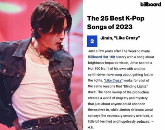 지민의 '라이크 크레이지'는 미국 빌보드에서 지난해 12월 28일 공식 홈페이지를 통해 발표한 '2023 최고의 K팝 25곡'(The 25 Best K-Pop Songs of 2023) 중 솔로곡 최고 순위인 2위에 올랐다.