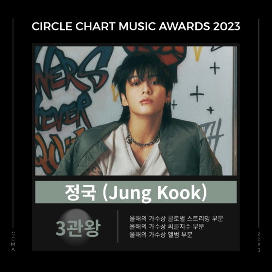 방탄소년단(BTS) 정국이 '써클차트 뮤직 어워즈 2023'에서 3관왕에 오르며 인기를 빛냈다.