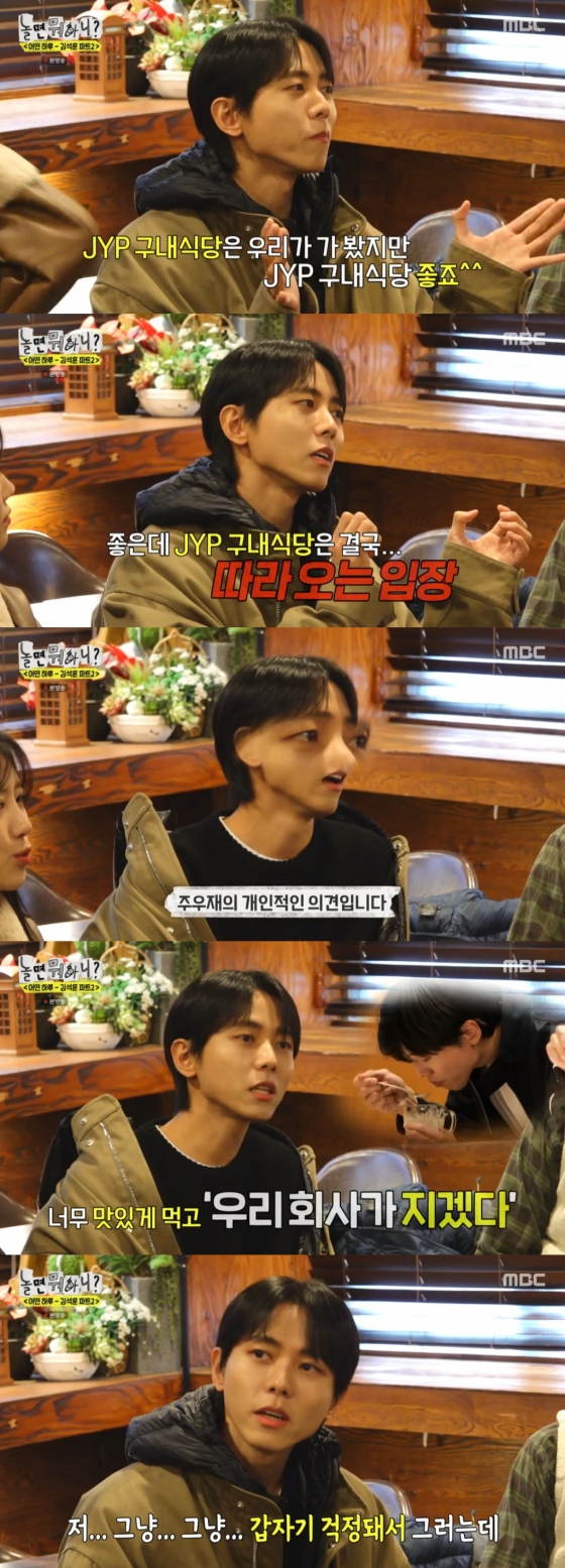 이를 들은 멤버들은 "괜찮냐", "확실하냐"라며 JYP 구내식당을 견제하는 듯한 주우재의 발언을 걱정했고, 결국 주우재는 "그냥 갑자기 걱정돼서 그러는데 JYP 멘트를 쫌 빼주시길 바랍니다"라며 "왜냐하면 지난 방송 때 JYP 구내 식당에서 중독자처럼 아이스크림을 맛있게 먹고 '우리 회사가 지겠다'라는 멘트를 했는데 기사가 나고 우리 회사 사람들이 다 본 거다. 오늘 오해를 풀어야한다"라고 제작진들에게 간곡히 부탁했다.