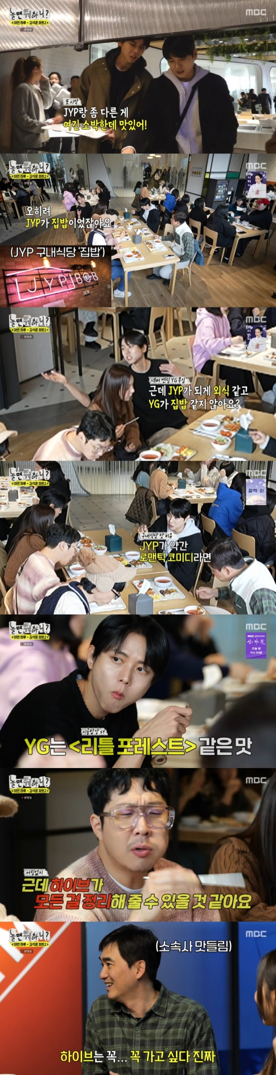 주우재는 YG와 JYP 구내식당을 계속해서 비교했다. 그는 "JYP랑 다른 게 YG는 소박한데 맛있다. 오히려 JYP가 집밥이지 않았나. 근데 JYP가 되게 외식 같고 YG가 집밥 같지 않냐"라며 YG 구내식당을 자랑했고, 이이경은 "JYP가 로맨틱 코미디라면 YG는 '리틀포레스트' 느낌이다"라고 이야기했다.