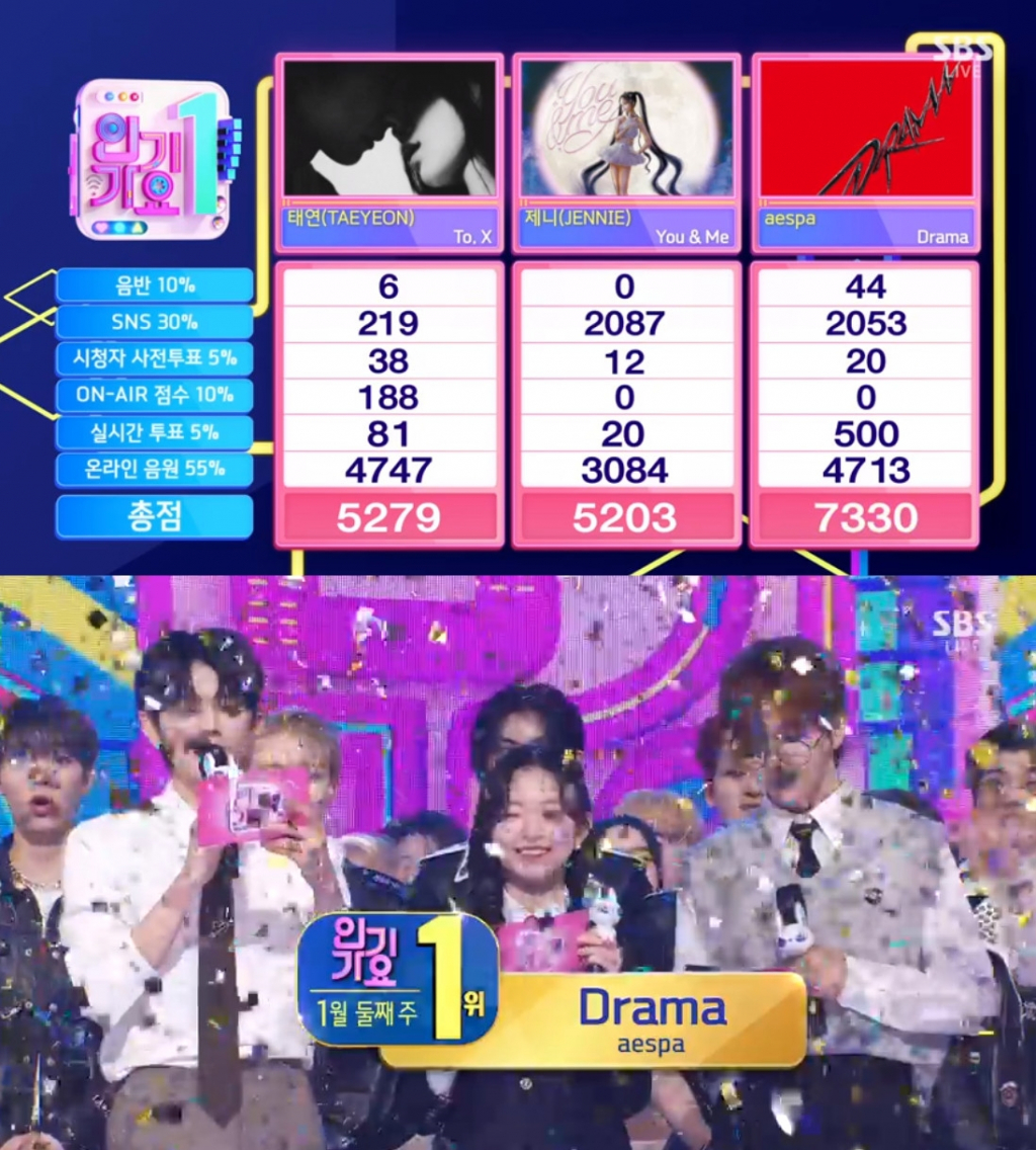 14일 방송된 SBS '인기가요'에는 태연 'To.X'(투 엑스), 제니 'You & Me'(유 앤 미), 에스파 'Drama'(드라마)가 1월 둘째주 1위 후보에 올랐다.