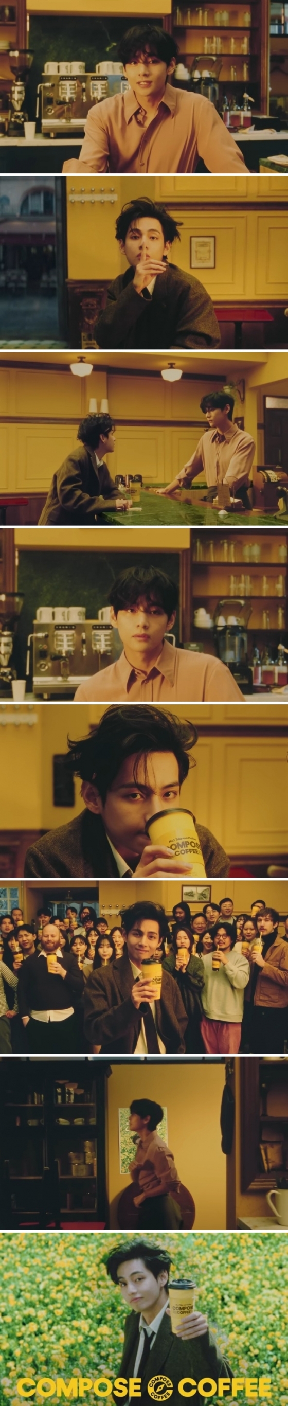 광고는 눈발이 흩날리는 추운 겨울을 배경으로 한 카페에서 진행됐다. 바리스타로 변신한 뷔가 주문한 커피가 나왔다고 말하는 순간, 작곡가로 변신한 뷔가 작곡에 몰입한 채 냅킨에 무엇인가를 열심히 쓰고 있다.