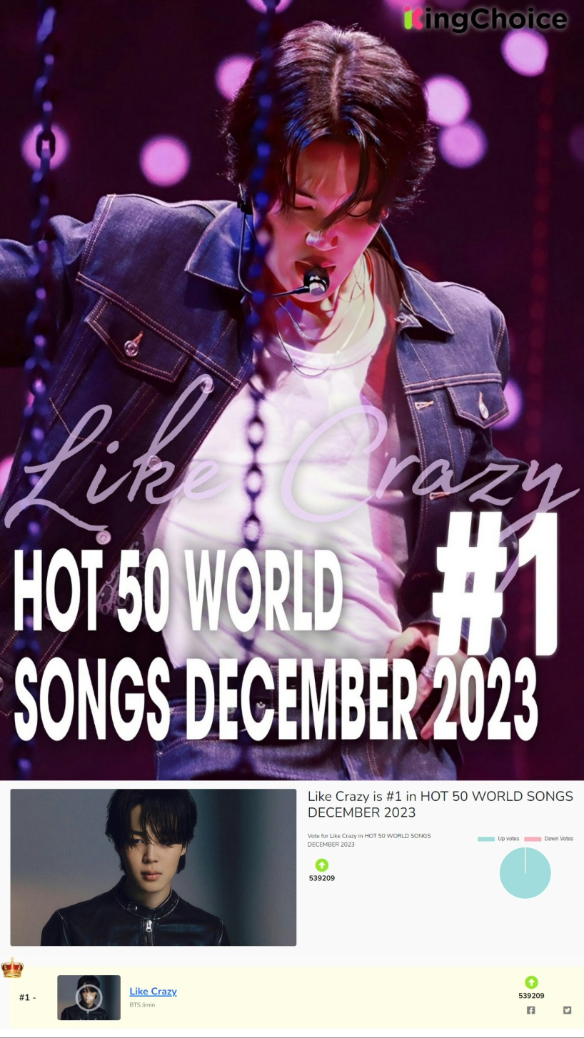 지민의 '라이크 크레이지'는 2023년 12월 16일부터 12월 31일까지 글로벌 K팝 투표 사이트 '킹초이스(King Choice)'에서 실시한 '2023년 12월 월드송 핫 50(Hot 50 World Songs December)' 투표 1위에 올랐다.