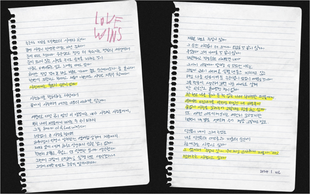 아이유는 "여담으로 다섯 곡이 담긴 이 앨범에는 내가 사랑하는 사람들에게, 특히 나의 팬들에게 바치는 두 곡이 있는 데 그중 하나가 이 곡 Love wins다. 느닷없이 큰 사랑을 받으며 하루아침에 인생이 달라졌던 열 여덟 살부터 지금까지. 저무는 일에 대해 하루도 상상하지 않은 날이 없다. 막연히 외롭고, 무섭고, 또 당연한 일이라 생각했다. 그런데 그렇게 매일매일 십몇 년을 생각했더니 그것에 대한 태도도 조금씩 달라지더라. 지금은 별로 무섭지 않다. 그 순간 아쉬움이 더 크거나 외로울 것 같지 않다. 무엇보다 그리 가까울 것 같지 않다"고 전했다.
