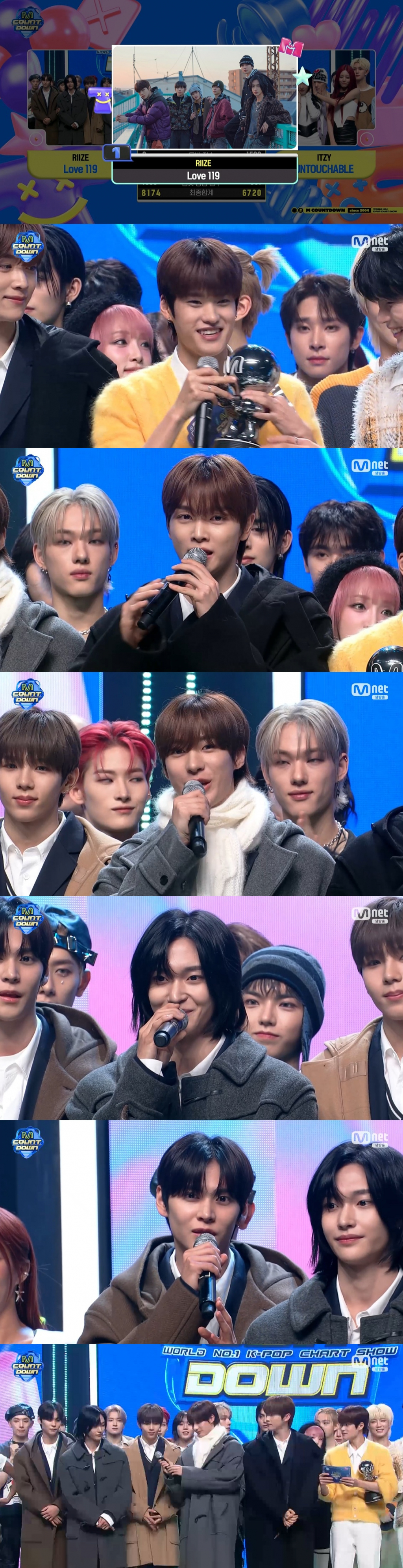 이날 라이즈는 지난 5일 발매한 싱글 'Love 119'로 '엠카운트다운' 1위에 올랐다. 소희는 "데뷔 후 첫 번째 1위를 하게 돼서 팬들에게 너무 감사하다. 이 상 소중히 기억하겠다. 브리즈(팬덤명) 너무 고맙다", 성찬은 "브리즈 감사하고 사랑한다. 우리를 위해 항상 힘써주시는 SM엔터테인먼트 식구들에게도 감사하다는 말씀드리고 싶다"라며 1위 수상 소감을 밝혔다.