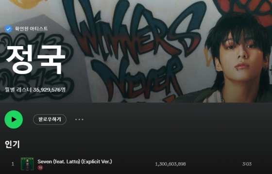 지난해 7월 정국이 발매한 솔로 싱글 'Seven'은 최근 세계 최대 음원 스트리밍 플랫폼 스포티파이에서 13억 스트리밍(필터링 전)을 넘어섰다.