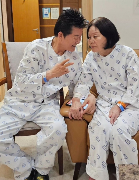 공개된 사진 속엔 태진아가 아내와 함께 병원에서 환자복을 입고 있다. 두 사람은 힘든 상황 속에서도 밝게 웃으며 서로를 향한 애정을 드러내고 있다.