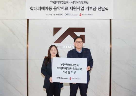 YG는 최근 서울 합정동 신사옥에서 YG 황보경 공동대표, 세이브더칠드런 정태영 총장과 김희권 대외협력 부문장이 참석한 가운데 '세이브더칠드런 학대피해아동 음악치료 지원 사업 기부금 전달식'을 진행했다.