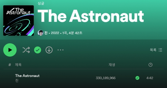 진의 솔로곡 '디 애스트로넛' 음원은 세계 최대 음원 플랫폼 스포티파이(Spotify)에서 1월 20일 기준 3억 3018만 스트리밍을 넘어섰다.