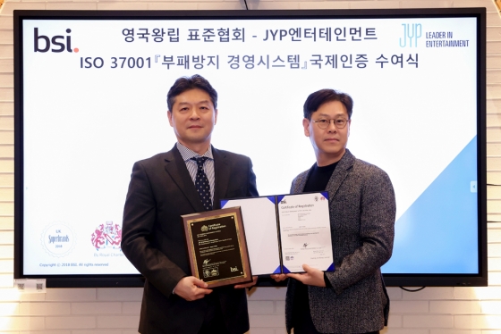 JYP엔터테인먼트(이하 JYP)가 업계 최초로 영국왕립표준협회(BSI, British Standards Institution)로부터 부패방지 경영시스템(ISO 37001) 국제 인증을 획득했다.