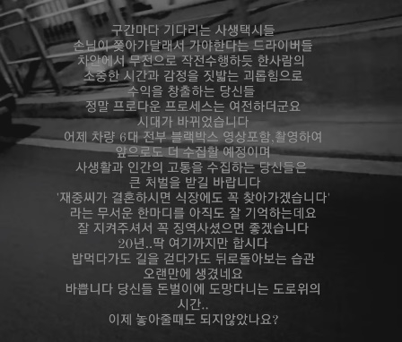 김재중은 22일 "구간마다 기다리는 사생 택시들. 손님이 쫓아가 달래서 가야 한다는 드라이버들"이라며 영상을 올렸다.