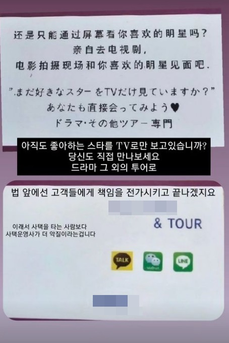 그는 사생택시 운영사의 광고를 공개하며 "이래서 사택을 타는 사람보다 사택운영사가 더 악질이라는 겁니다"라고 사생택시 운영사에도 문제가 있음을 지적했다. 김재중이 공개한 사생택시 광고 문구엔 '아직도 좋아하는 스타를 TV로만 보고 있습니까. 당신도 직접 만나보세요. 드라마 그 외의 투어로'라고 적혀 있어 충격을 줬다. 이 광고는 중국어, 일본어로 적혀있어 외국 사생들이 한국 사생택시를 이용해 일종의 '관광'처럼 하는 상품이 있다는 사실을 알렸다.