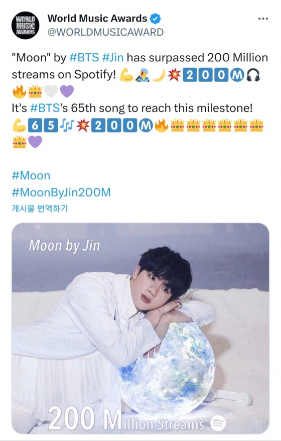 최근 '월드 뮤직 어워드'(World Music Award/WMA)는 공식 계정을 통해 "진의 'Moon'이 스포티파이에서 2억 스트리밍을 돌파했다. 방탄소년단 모든 노래 중 2억 스트리밍을 달성한 65번째 곡이다"라며 축하를 전했다.