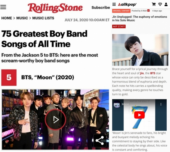 지난 5일 미국 연예 매체 올케이팝(Allkpop)은 '영혼에서 우러나오는 보컬' 진의 음악 발자취에 대해 집중조명하면서 "문(Moon)은 그가 노래하는 천체(우주)처럼, 그의 목소리는 한결같이 위로가 된다"고 찬사를 보냈다.
