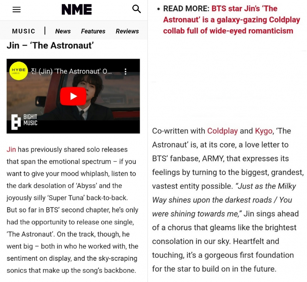방탄소년단(BTS) 진이 영국 음악지 NME의 뜨거운 찬사를 받으며 존재감을 빛냈다.