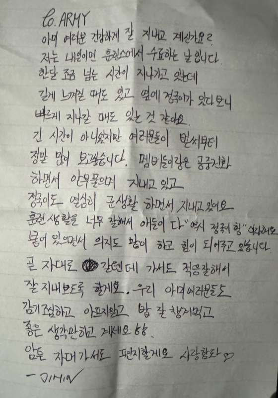 또한 "곧 자대로 갈 텐데 가서도 적응 잘해서 잘 지내보도록 하겠다"라며 "우리 아미 여러분들도 감기 조심하고 아프지 말고 밥 잘 챙겨 먹고 좋은 생각만 하고 계시길 바란다"라고 덧붙였다.