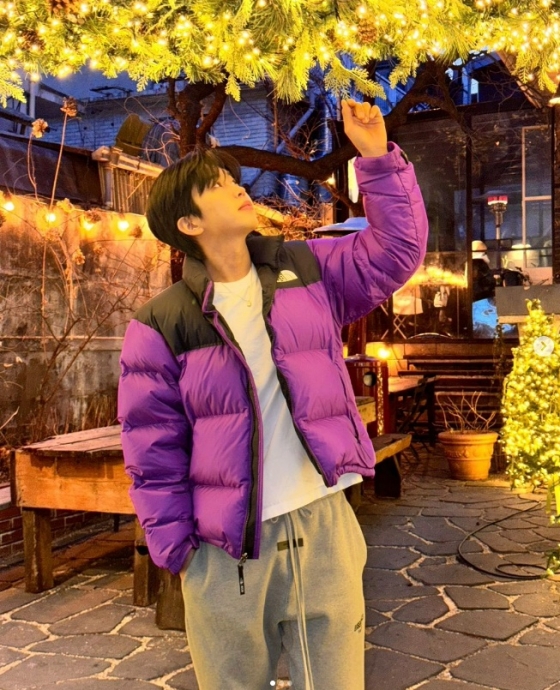 사진 속 임영웅은 트리 조명이 가득한 야외에서 잠시 여유를 즐기는 모습이었다.