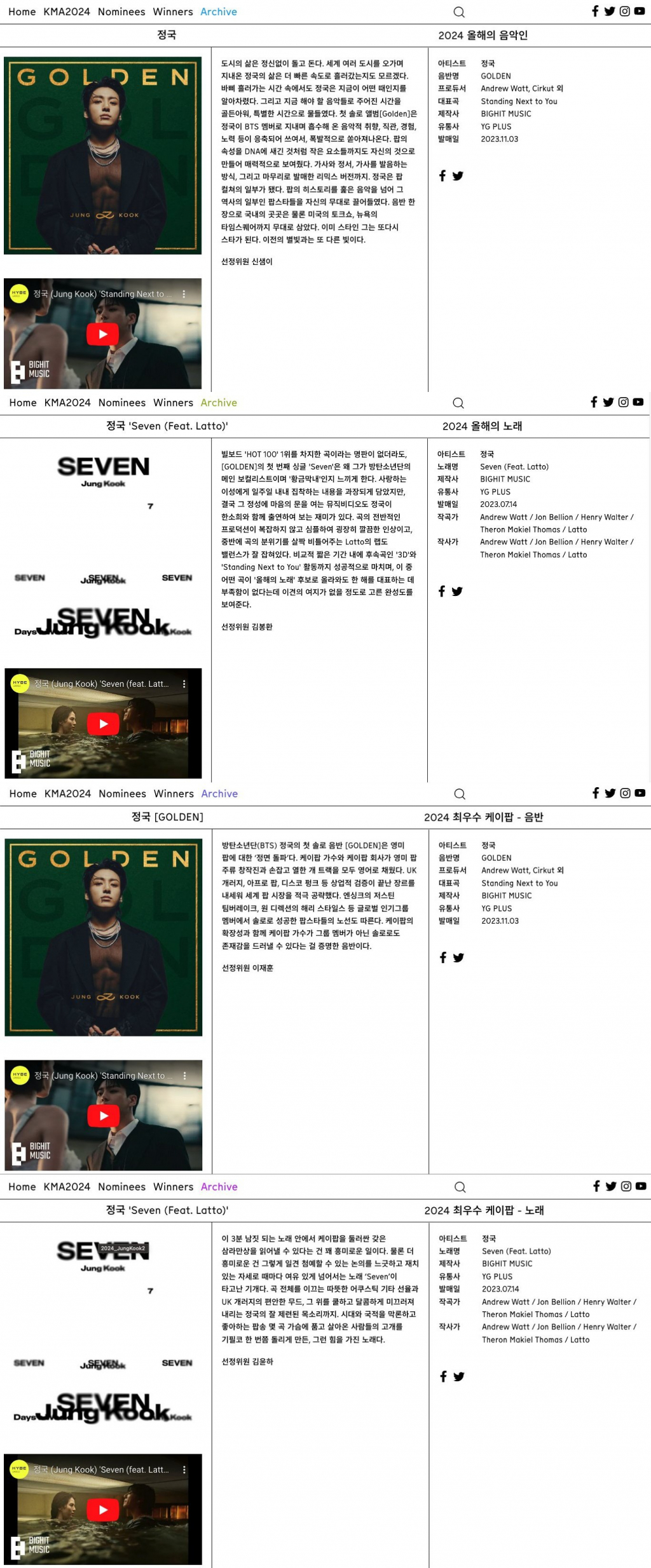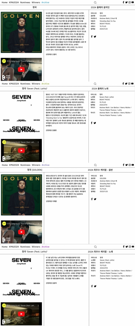 정국은 최근 발표된 '제21회 한국대중음악상' 후보 명단에서 '올해의 음악인'과 솔로 싱글 'Seven'(세븐)으로 '올해의 노래', 첫 솔로 앨범 'Golden'(골든)으로 '최우수 K팝 음반', 'Seven'으로 '최우수 K팝 노래' 등 총 4개 부문 후보에 올랐다.