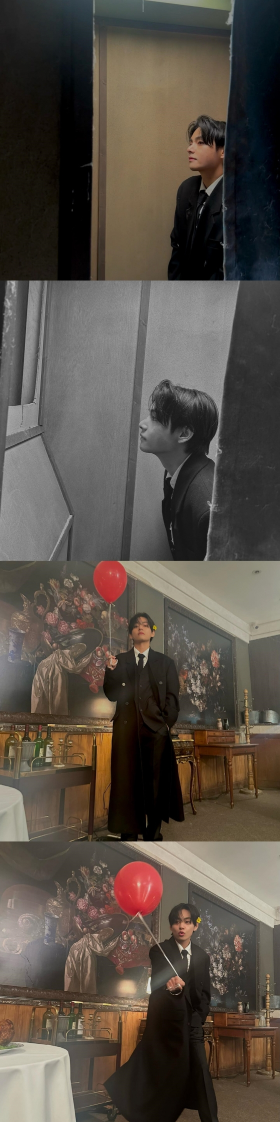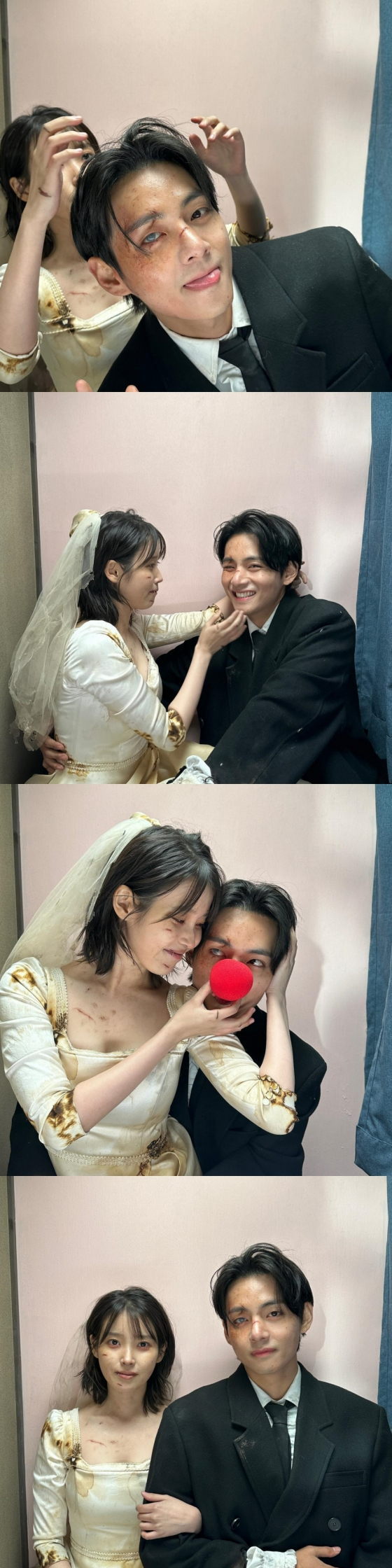 사진 속 뷔와 아이유는 뮤직비디오에서의 모습 그대로 낡은 턱시도와 웨딩드레스를 입고 다양한 표정과 포즈로 사랑스러운 분위기를 자아냈다.