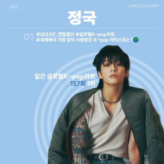 정국은 2023년 글로벌 K-팝 차트에서 무려 157회 1위를 기록하며 세계에서 가장 많이 사랑받은 아티스트로 등극했다.