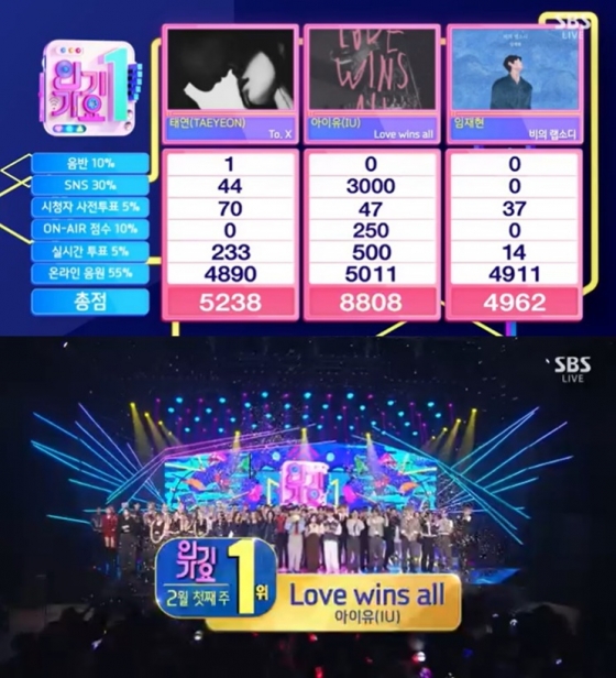 4일 오후 방송된 SBS 음악 프로그램 '인기가요'에서는 아이유가 1위를 차지했다. 이날 2월 1주차 1위 후보로 태연 'To. X', 아이유 'Love wins all', 임재현 '비의 랩소디'가 올랐다.