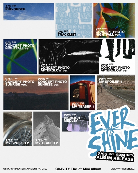 소속사 스타쉽엔터테인먼트는 지난 4일 공식 SNS를 통해 크래비티(세림, 앨런, 정모, 우빈, 원진, 민희, 형준, 태영, 성민)의 일곱 번째 미니 앨범 '에버샤인(EVERSHINE)' 스케줄러 이미지를 공개했다.