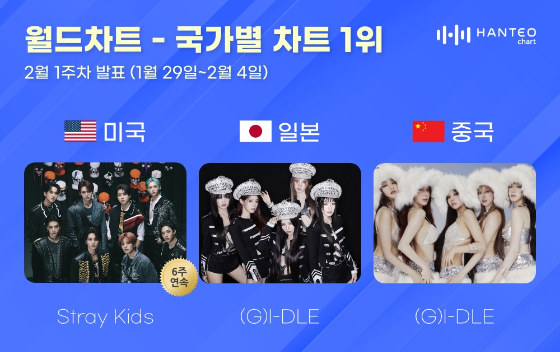 그룹 스트레이 키즈(Stray Kids)와 (여자)아이들 ((G)I-DLE)이 한터차트 2월 1주 차 국가별 차트에서 인기를 입증했다.