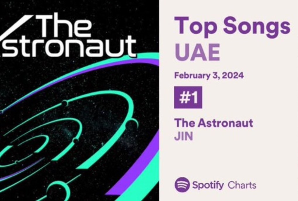 진의 첫 솔로 싱글 '디 애스트로넛'은 스포티파이 '데일리 톱 송 아랍에미리트' 차트(2월 3일 자) 1위에 올랐다.