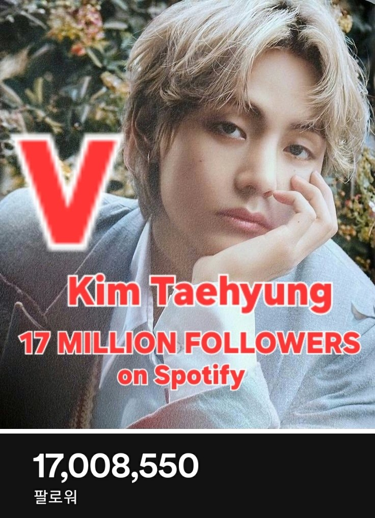 방탄소년단(BTS) 뷔가 세계 최대 음원 플랫폼 스포티파이(Spotify) 팔로워 1700만 명을 돌파하여 군 복무 중에도 변함없이 뜨러운 인기를 과시했다.