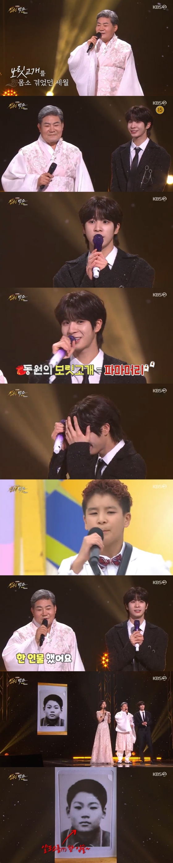 진성은 "나도 어릴 때 한 인물했다. 제 얼굴이 동원이 얼굴이랑 닮은 데가 많다"고 너스레를 떨었다. 이와 함께 진성의 초등학교 졸업사진이 공개됐고 진성은 "나는 전혀 창피하지 않다. 까만 숯댕이 눈썹하며, 얄포소름한 입술하며, 오똑한 코 저정도면 괜찮은 얼굴이다"라고 자신감을 보였다. 정동원은 '여백'으로 무대를 마무리했다.