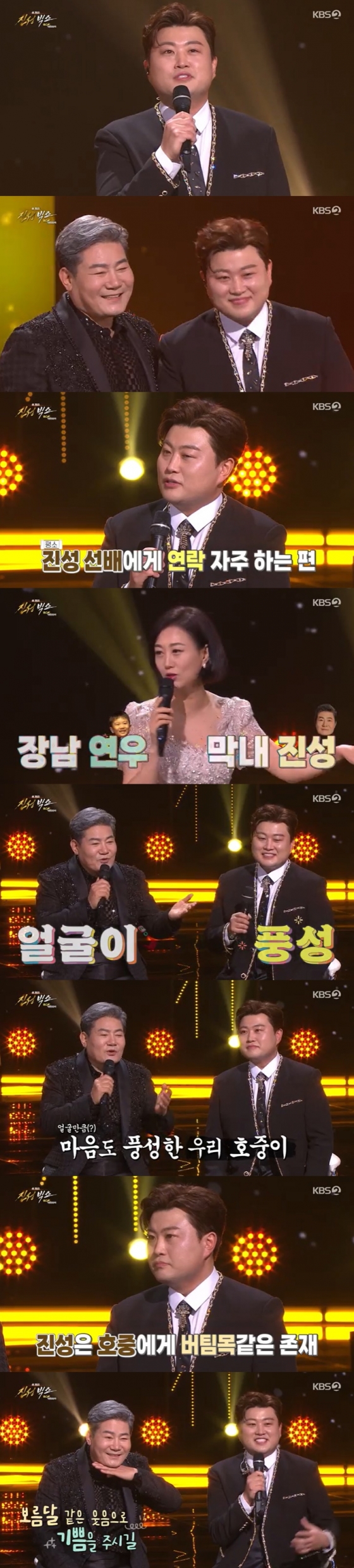 진성은 "호중이 얼굴만 봐도 기분이 좋다. 풍성하고 마음도 폭이 넓다"라며 김호중에 대한 애정을 아끼지 않았다. 김호중 역시 진성에게 "지금처럼만 저희에게 보름달 같은 웃음이 끊이지 않게 좋은 노래 더 많이 들려달라. 건강하세요"라고 전했다.