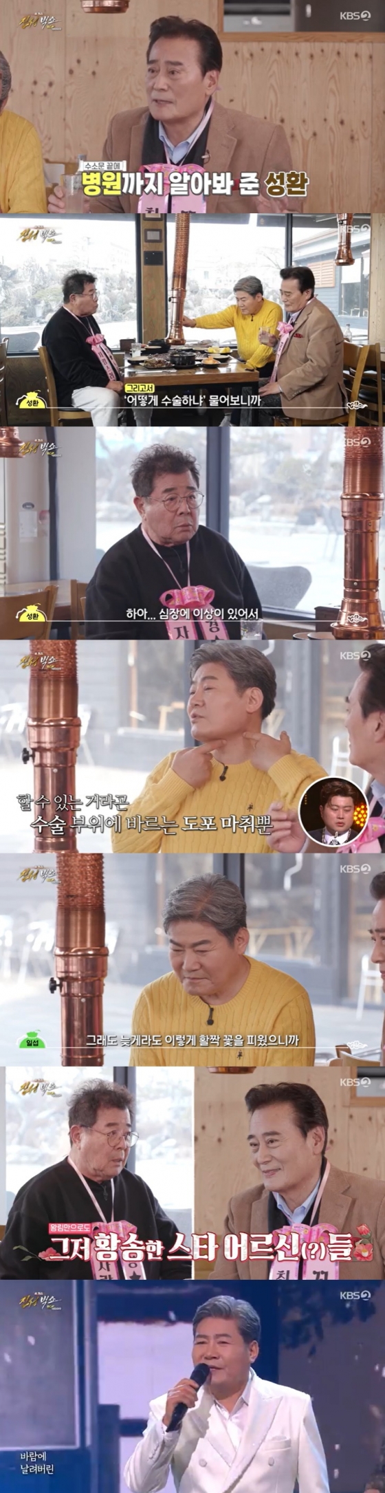 김성환은 진성이 혈액암에 걸렸던 때를 떠올리며 "이 동생이 암 수술을 한다는 거다. 어떻게 수술하냐 물어보니까 심장에 이상이 있어서 마취를 못 한다고 하더라"고 했고, 진성은 "밖으로 바르는 크림을 바르고 수술했다"고 전했다. 진성은 "'안동역에서'가 나오고 돈을 좀 벌까 했더니 덜썩 몸이 아프더라"라고 말했다. 백일섭은 "그래도 늦게라도 이렇게 활짝 꽃을 피웠으니 나도 배운다. 진성은 남진 못지 않은 가수다. 꾸준히 해서 10년 더 후를 보자"라고 덕담했다. 진성은 '안동역에서', '단발머리' 무대로 공연의 절정을 보여줬다.