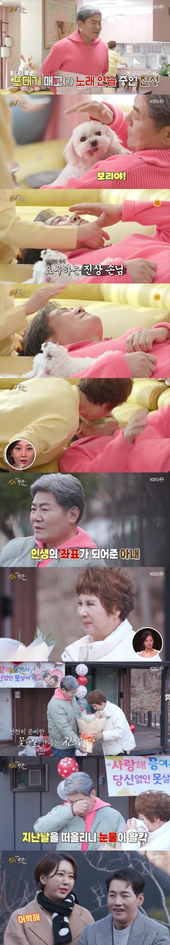진성은 '트로트계 최수종' 별명을 얻었다며 집안에서의 모습도 공개했다. 진성은 10세 반려견 '보리'를 포대기로 업으며 '개아빠'로서의 다정한 모습을 보이는가 하면, 결혼 16년 차가 된 아내에게 피부 마사지와 뽀뽀를 받으며 '사랑꾼' 면모도 보였다. 후배 가수 박군과 현영 부부가 진성네를 방문해 진성과 아내의 러브스토리를 물었다. 진성 아내는 "20년 전 음반 가게에서 칼날 같은 목소리가 들리더라. '태클을 걸지마' 메들리 음반을 사서 5년 동안 계속 들었다. 어느 날 친구가 하는 추어탕 가게에 놀러갔는데, 진성을 40세에 만나게 됐다"고 밝혔다. 진성은 지금의 아내를 만나고 자신의 혈액암을 극복할 수 있었다며 아내를 향한 깜짝 이벤트를 선보이기도 했다.