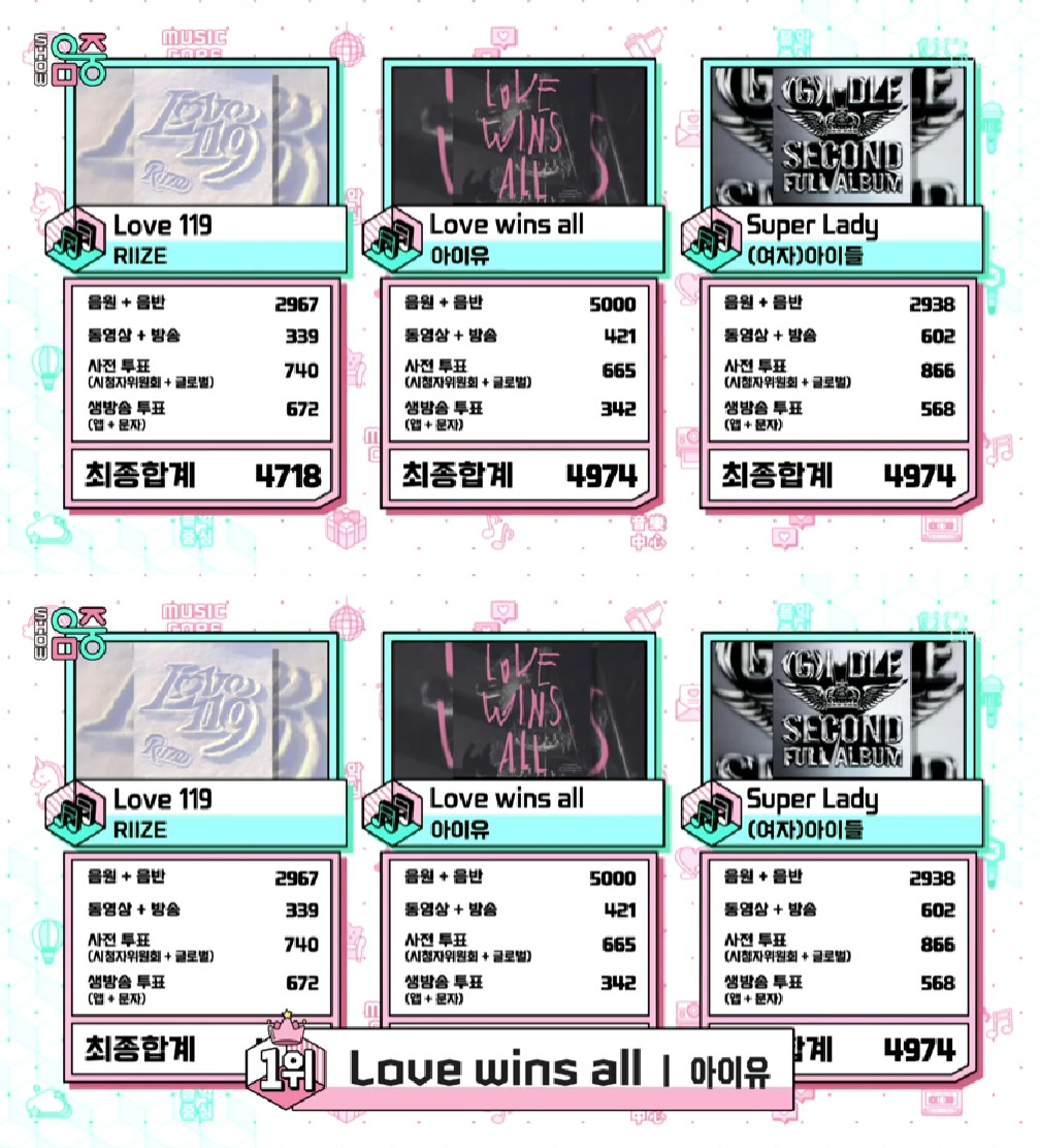 이날 1위의 주인공은 아이유의 'Love wins all'이었다. 아이유는 출연 없이 1위 트로피를 추가하게 됐다. 'Love wins all'은 미니멀하고 빈티지한 피아노 인트로로 운을 띄워 맥시멈 한 아웃트로에 이르기까지 기승전결이 확실한 발라드 곡이다.