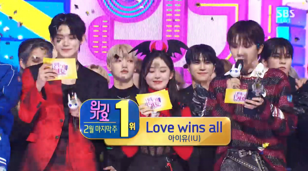 이날 아이유는 '인기가요'에 출연하지는 않았지만, 지난 20일 발매한 여섯 번째 미니앨범 'The Winning' 수록곡 'Love wins all'로 1위 트로피를 품에 안았다.