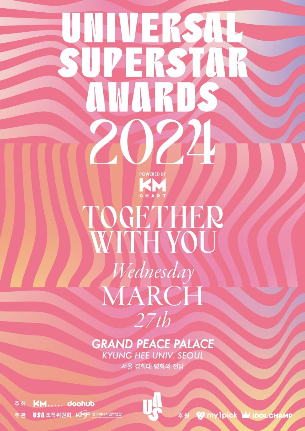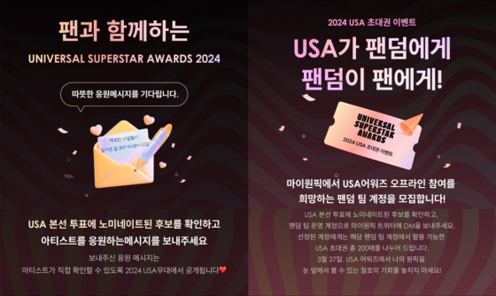 글로벌 스탠더드 K팝 차트 'KM차트'와 'doohub'가 주최하고 사단법인 한국매니지먼트연합이 주관하는 '2024 유니버설 슈퍼스타 어워즈(Universal Superstar Awards, 이하 '2024 USA')'는 KM차트 공식 투표 애플리케이션 '마이원픽(MY1PICK)'을 통해 팬덤을 대상으로 한 '초대권 이벤트'와 팬을 대상으로 한 '아티스트 응원 메시지 이벤트'를 각각 진행 중이다.