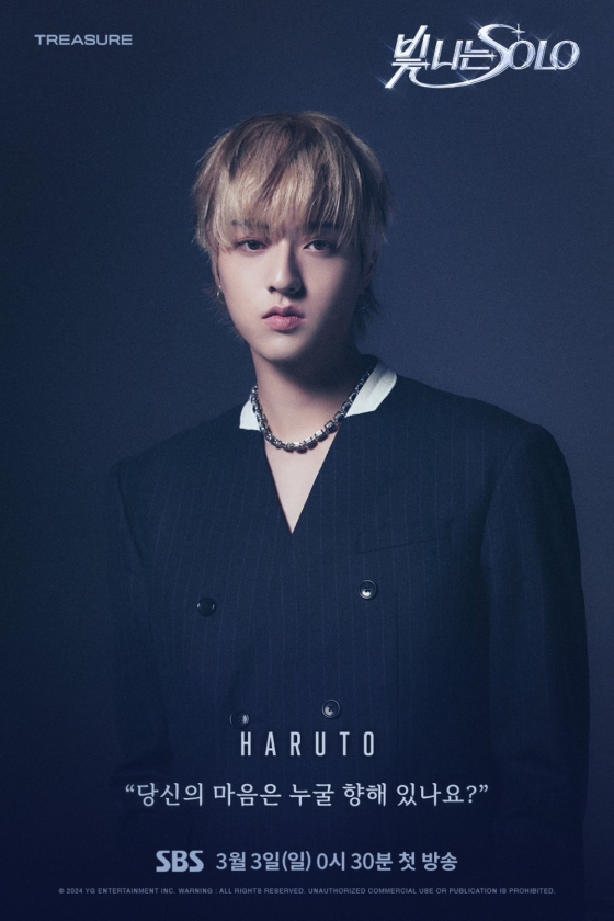 YG엔터테인먼트는 지난 26일 오후 공식 블로그에 TREASURE - '빛 나는 SOLO' CHARACTER POSTER 를 게재했다. 앞서 공개된 준규·아사히·지훈·윤재혁에 이어 다섯 번째 주자로 하루토의 이미지를 공개한 것.