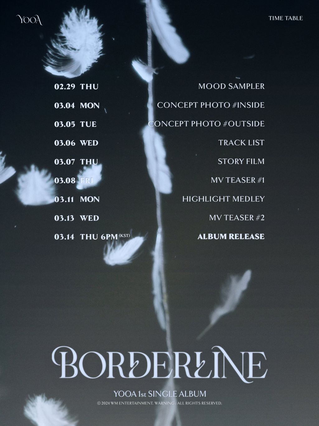 28일 소속사 WM엔터테인먼트는 공식 SNS 채널을 통해 3월 14일 발매될 유아의 첫 싱글 앨범 'Borderline'의 타임테이블을 공개, 풍성한 티저 콘텐츠를 예고하며 컴백 열기를 고조시키고 있다.