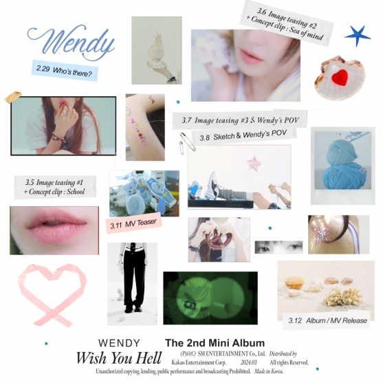 웬디 두 번째 미니앨범 'Wish You Hell'은 3월 12일 오후 6시 각종 음악 사이트에서 음원 공개되며, 같은 날 음반으로도 발매된다.