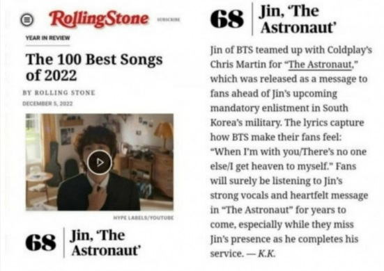 진은 '디 애스트로넛'으로 미국 음악 매거진 롤링스톤(Rolling Stone)이 뽑은 '2022년 최고의 노래 100'에서 아시아 솔로 가수 중 최고 순위에 오르는 등 훌륭한 음악성과 역량을 인정받았다.