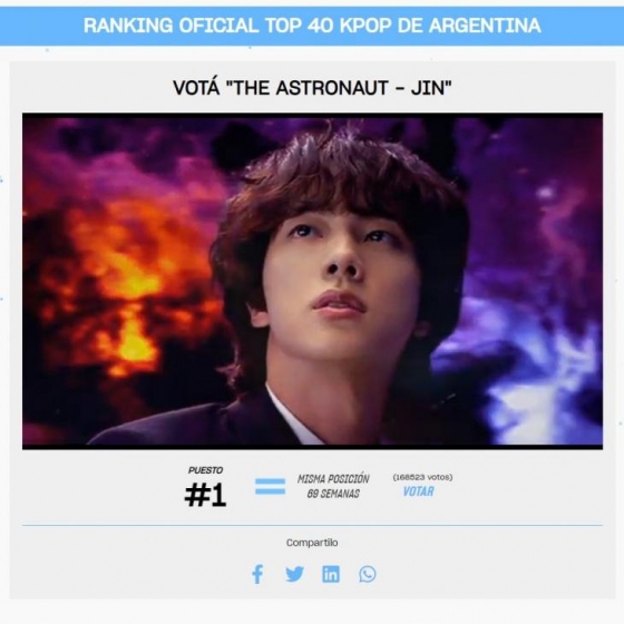 '디 애스트로넛'은 미국뿐 아니라 전 세계 라디오에서도 '절대강자'로 자리매김하고 있다. 아르헨티나 'Top 40 Kpop' 차트에서도 최근 69주 연속 1위를 기록했다. 아르헨티나 인기 라디오 채널인 '베가 라디오(@vegaradio)' 공식 계정이 최근 'Top40Kpop(@Top40Kpop)'으로 바뀌면서 Kpop 음악 순위를 집중적으로 알리며 글로벌 팬들의 열띤 호응이 이어졌다.