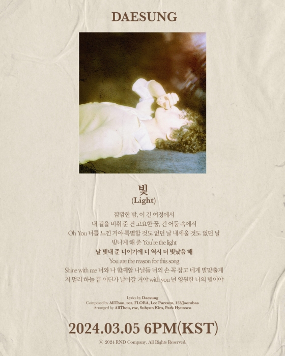 공개된 리릭 포스터에는 신곡 '빛(Light)'의 가사 일부와 대성의 모습이 담겨있다. 눈을 감고 누워있는 대성과 밝고 따뜻한 빛이 어우러져 몽환적이고 신비로운 분위기를 극대화시켜 신곡에 대한 궁금증을 자극했다. 특히 "날 빛내 준 너이기에 너 역시 더 빛났음 해", "넌 영원한 나의 빛이야" 등 인상적인 가사가 돋보인다.
