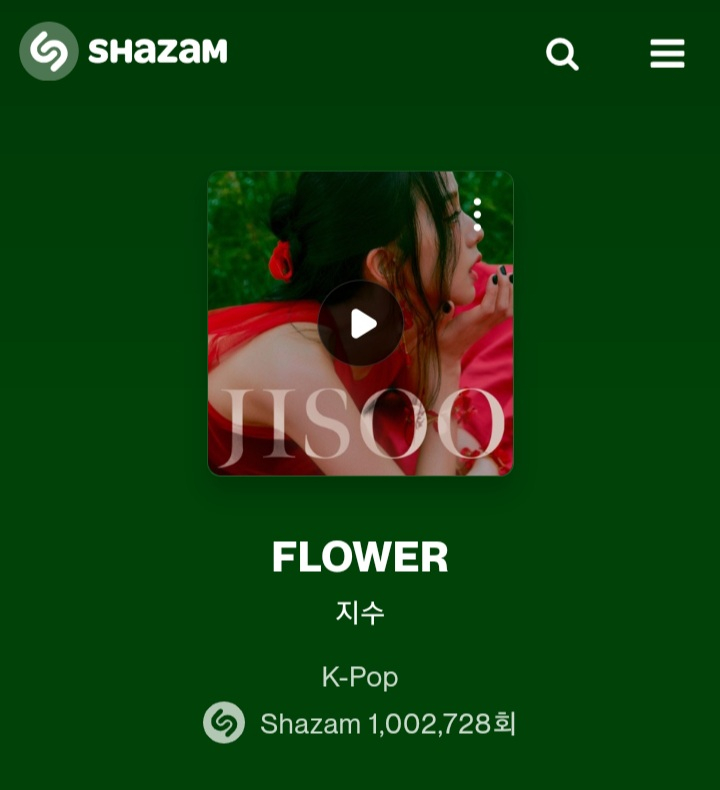 그룹 블랙핑크 지수의 솔로 데뷔곡 '꽃(FLOWER)'이 Shazam(샤잠) 100만 청취를 돌파했다.