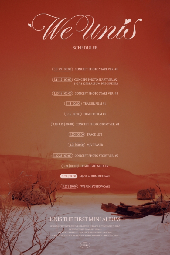 스케줄러에는 유니스의 데뷔 앨범명인 'WE UNIS(위 유니스)'라는 문구와 프로모션 공개 일정이 담겨있다. 이에 따르면 데뷔까지 유니스가 지닌 매력만큼이나 다채로운 콘텐츠가 즐비하다. 먼저 유니스는 오는 8일과 9일 스타트(START) 버전의 콘셉트 포토를 시작으로 두 가지의 트레일러 필름과 스토리(STORY) 버전의 콘셉트 포토를 공개한다.