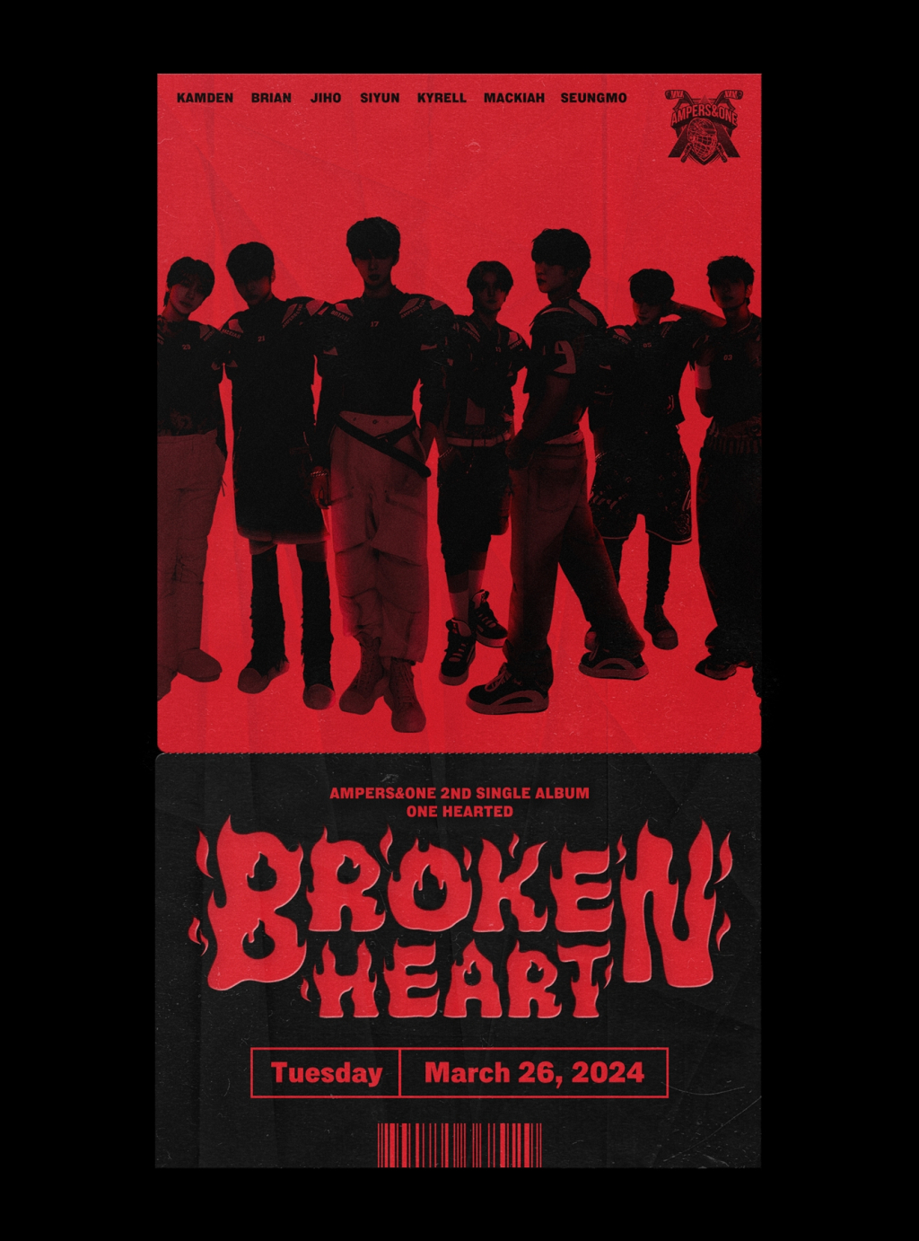 FNC엔터테인먼트는 7일 앰퍼샌드원 공식 SNS를 통해 두 번째 싱글 앨범 'ONE HEARTED'(원 하티드)의 컴백 포스터와 타이틀곡명 'Broken Heart'(브로큰 하트)를 공개했다.