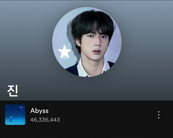 진의 '어비스'는 최근 세계 최대 음원 플랫폼 스포티파이에서 4600만 스트리밍을 달성했다. '어비스'는 3월 7일 기준 4633만 스트리밍을 넘어서며 뜨거운 인기를 이어가고 있다.