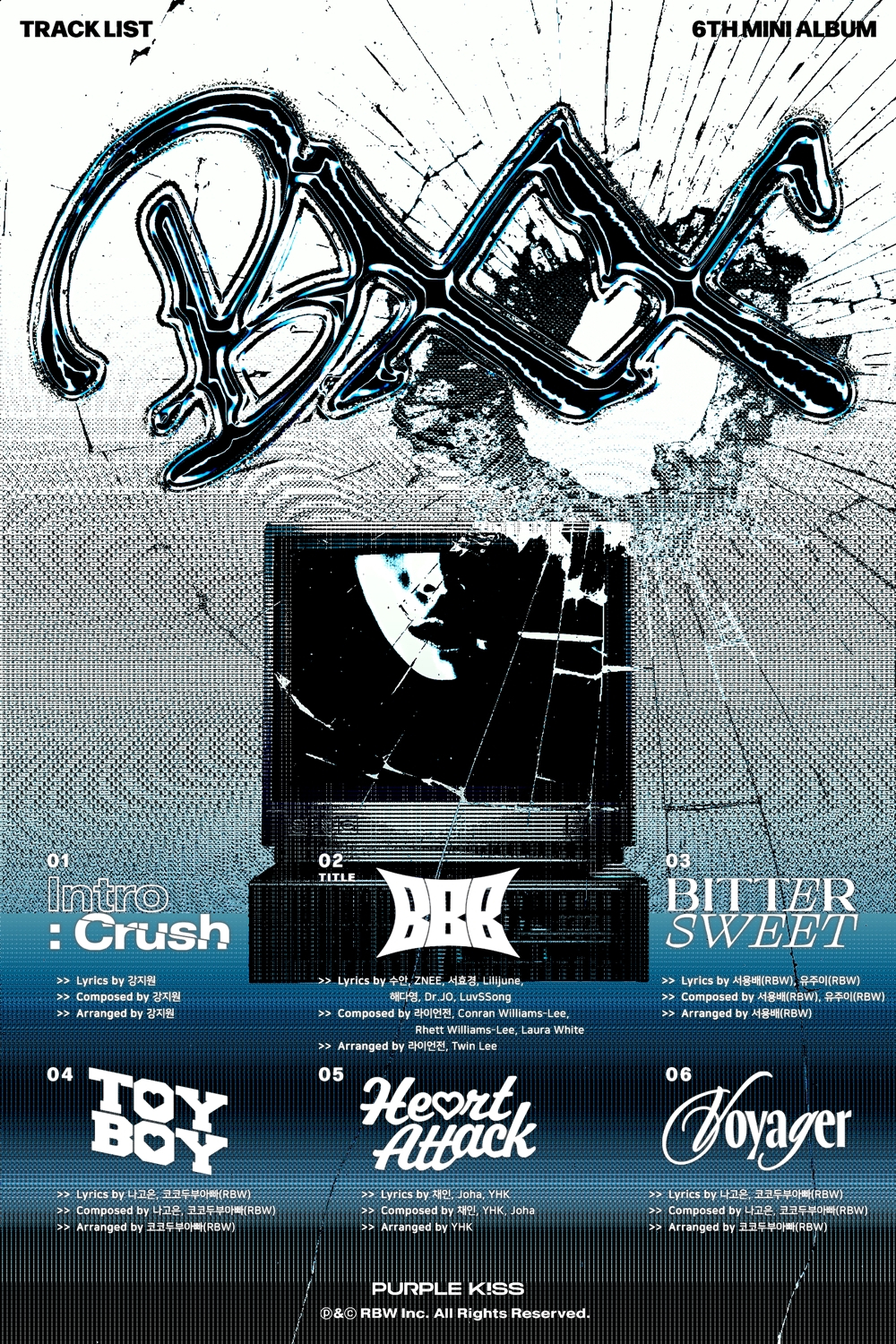 트랙리스트에 따르면, 신보에는 타이틀곡 'BBB'(비비비)를 포함해 'Intro : Crush'(인트로 : 크러시), 'BITTER SWEET'(비터 스윗), 'Toy Boy'(토이 보이), 'Heart Attack'(하트 어택), 'Voyager'(보이저) 등 총 6곡이 수록된다. K팝 대표 히트곡 메이커 라이언전이 타이틀곡 'BBB' 작곡에 참여한 것을 비롯 수록곡에는 서용배, 코코두부아빠 등 RBW 사단이 힘을 보태 완성도를 끌어올렸다.