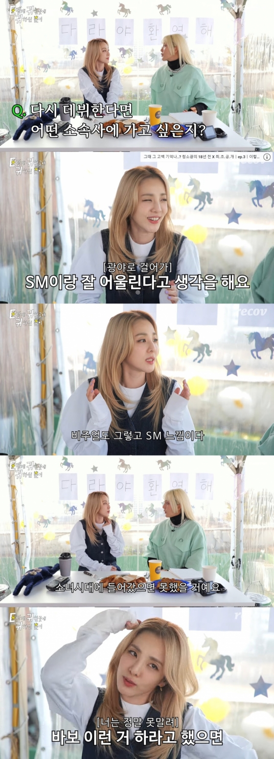 이날 '이귀귀' MC 바다는 산다라박에게 "만약에 다시 데뷔 전으로 돌아간다면 어느 소속사와 다시 시작하고 싶냐"라고 물었다. 이에 산다라박은 "데뷔 전 그때면, 그 당시로 생각하자면 SM이랑 너무 잘 어울린다고 생각한다. 사람들이 항상 나에게 '비주얼도 그렇고 SM 느낌이다'라는 말을 했었다"라고 대답했다.